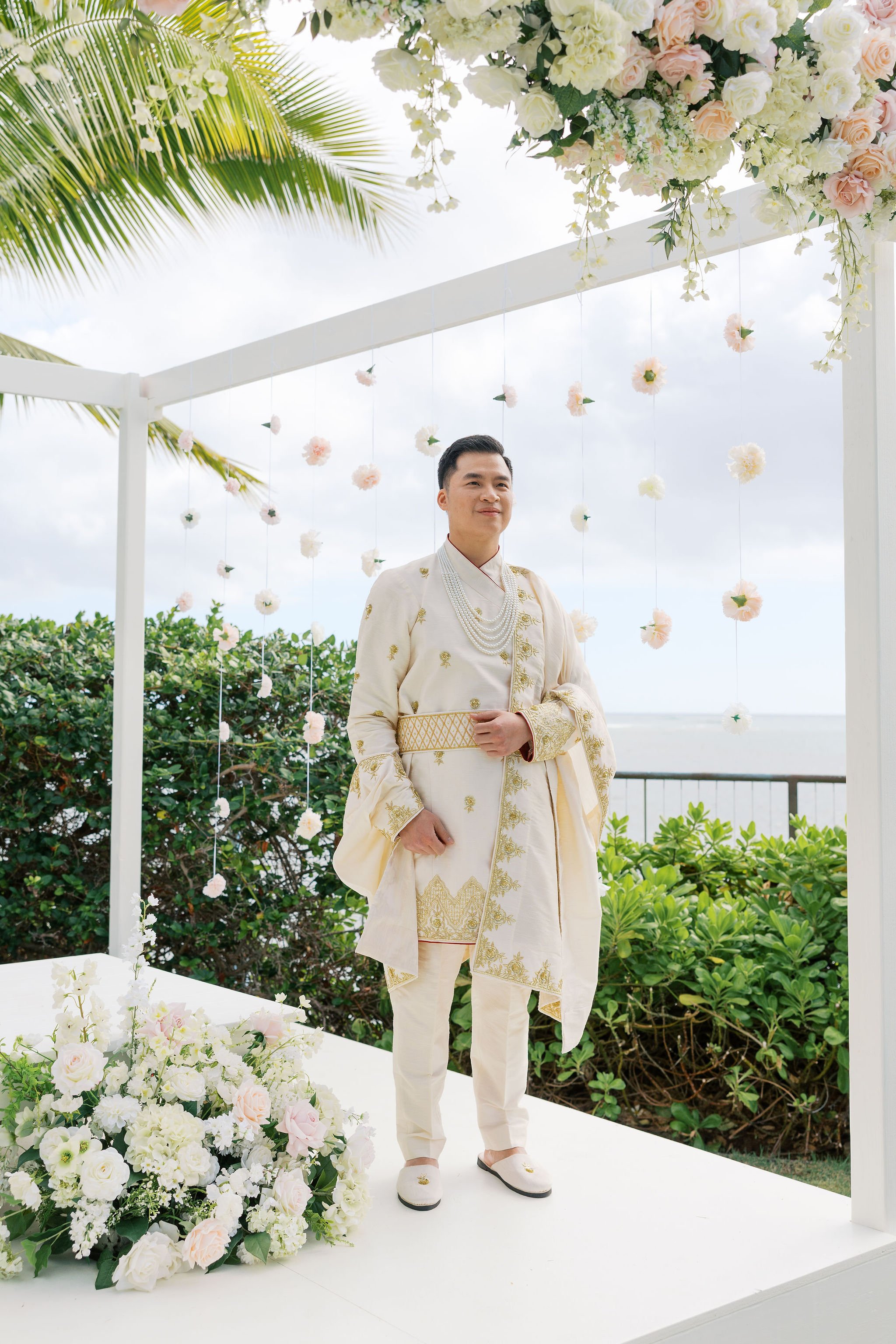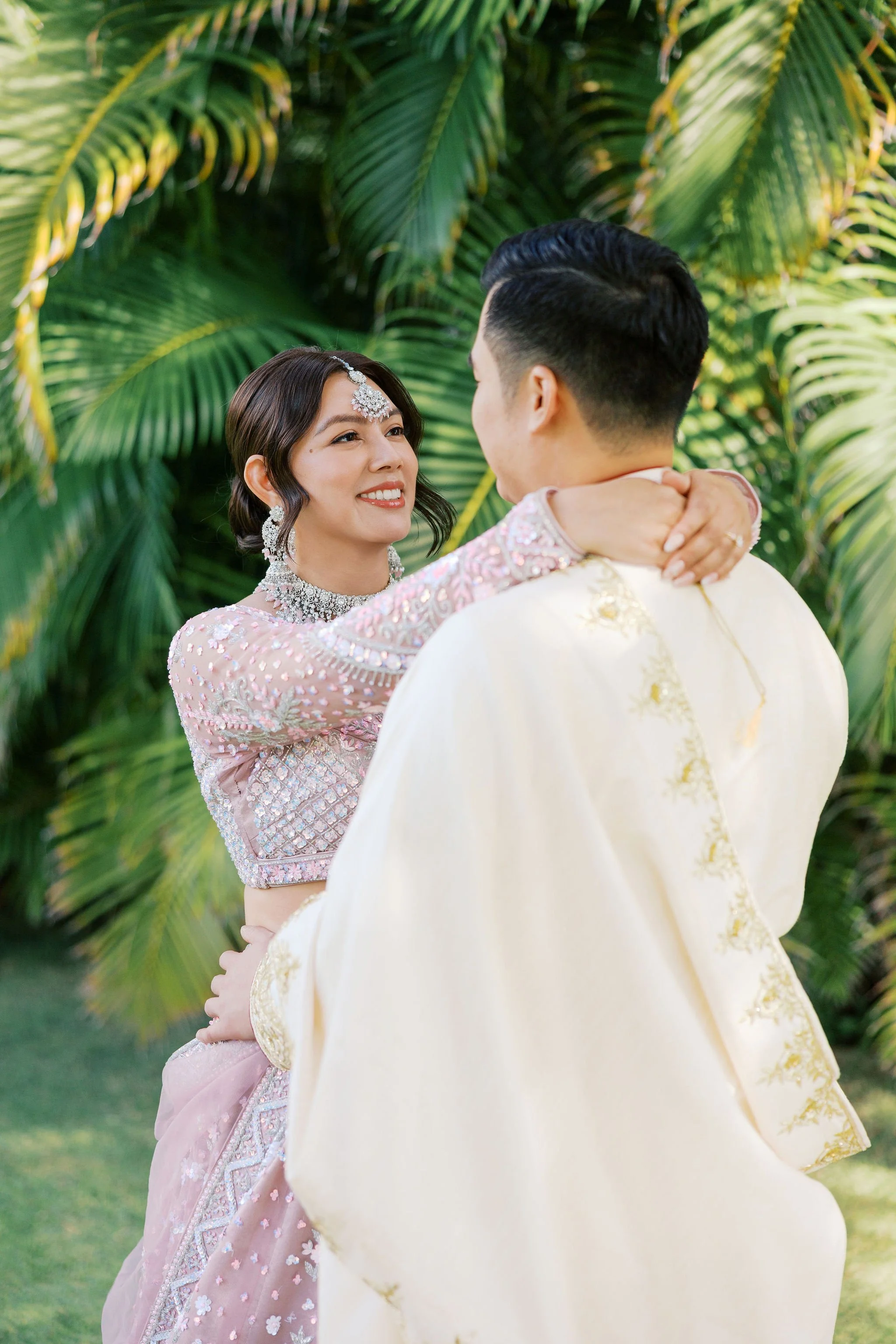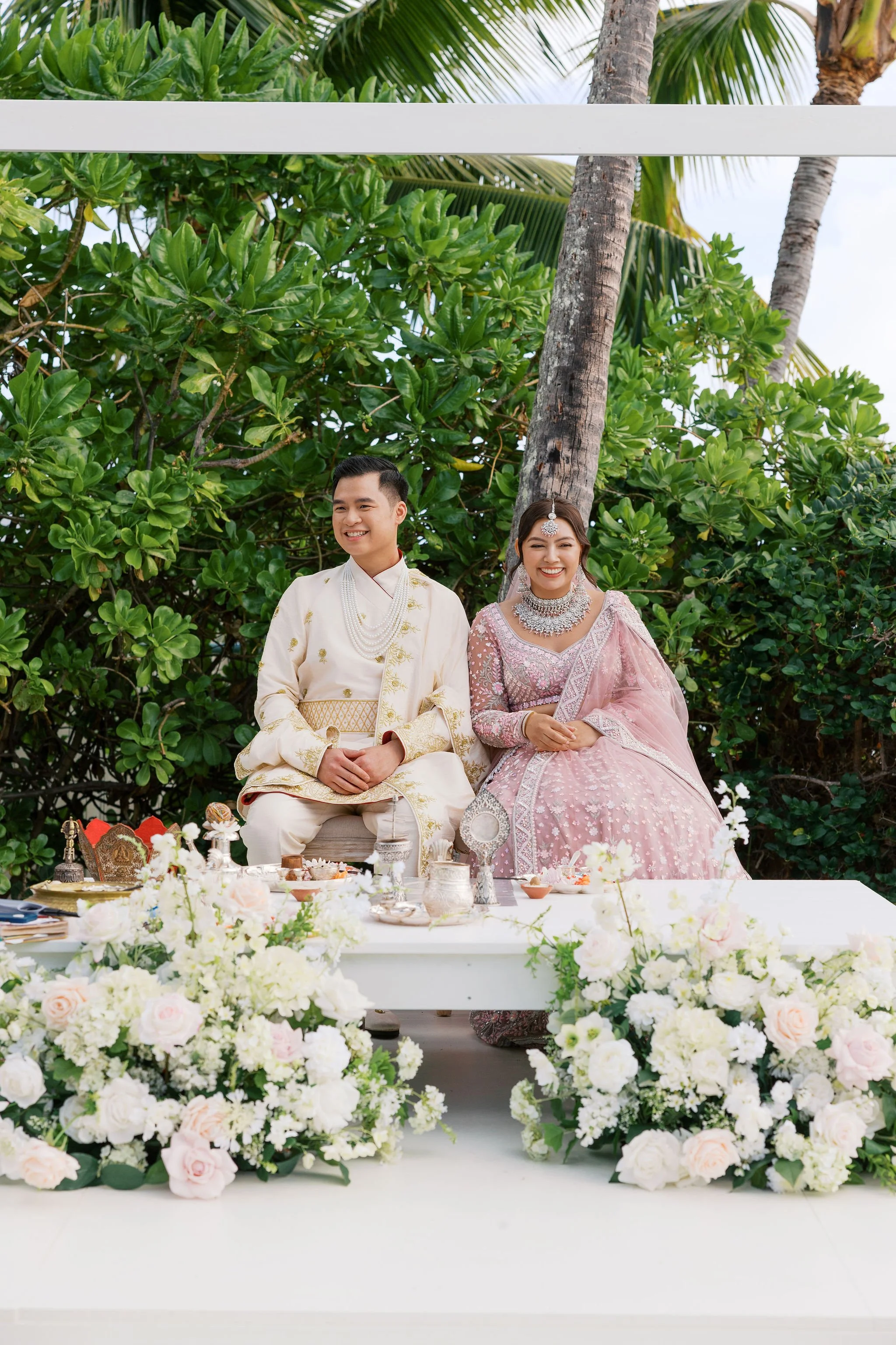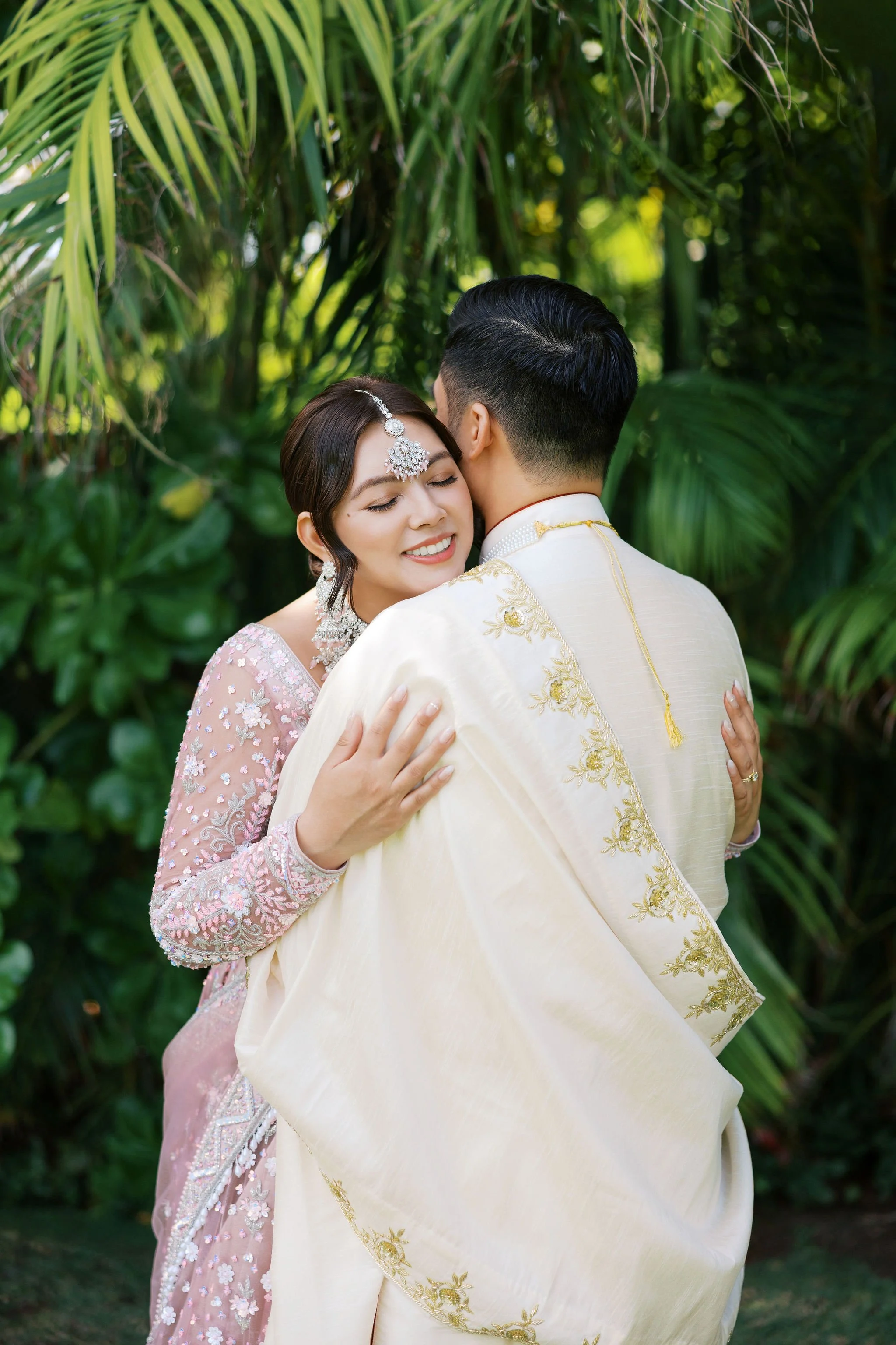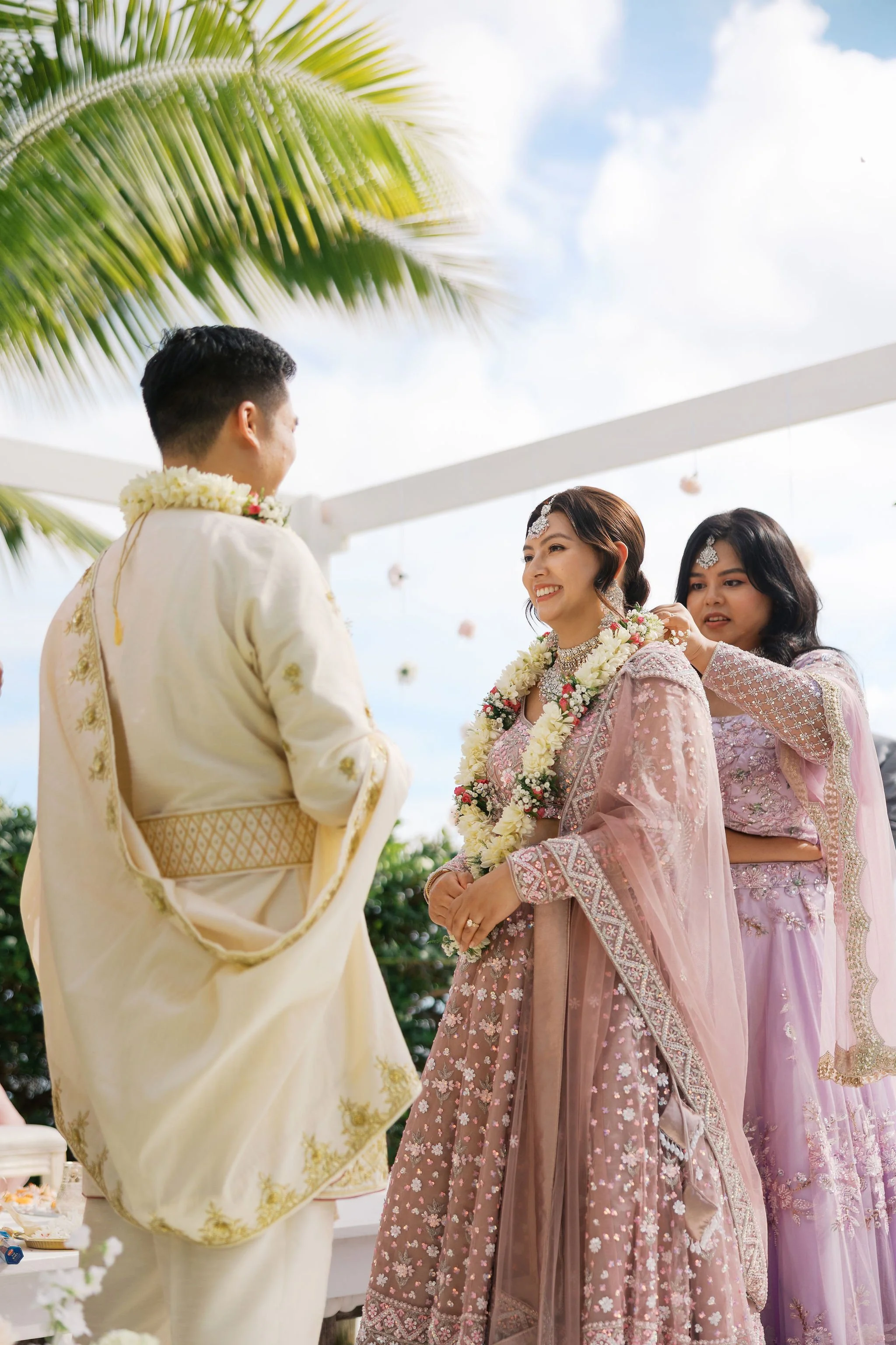 When Shradha stepped into her traditional Nepali bridal attire, the entire atmosphere shifted. The intricate details, elegant textures, and refined color palette created a timeless and sophisticated look against the tropical backdrop of Hawaii.