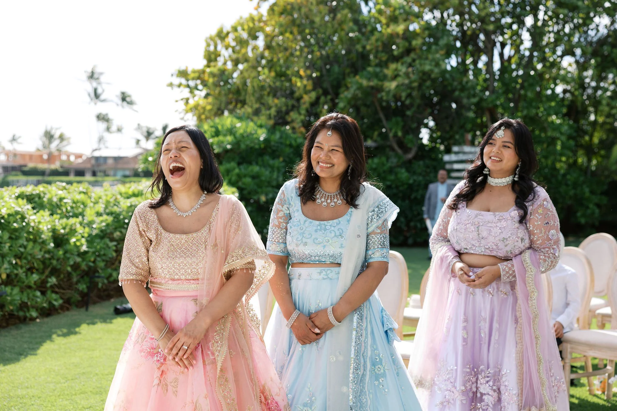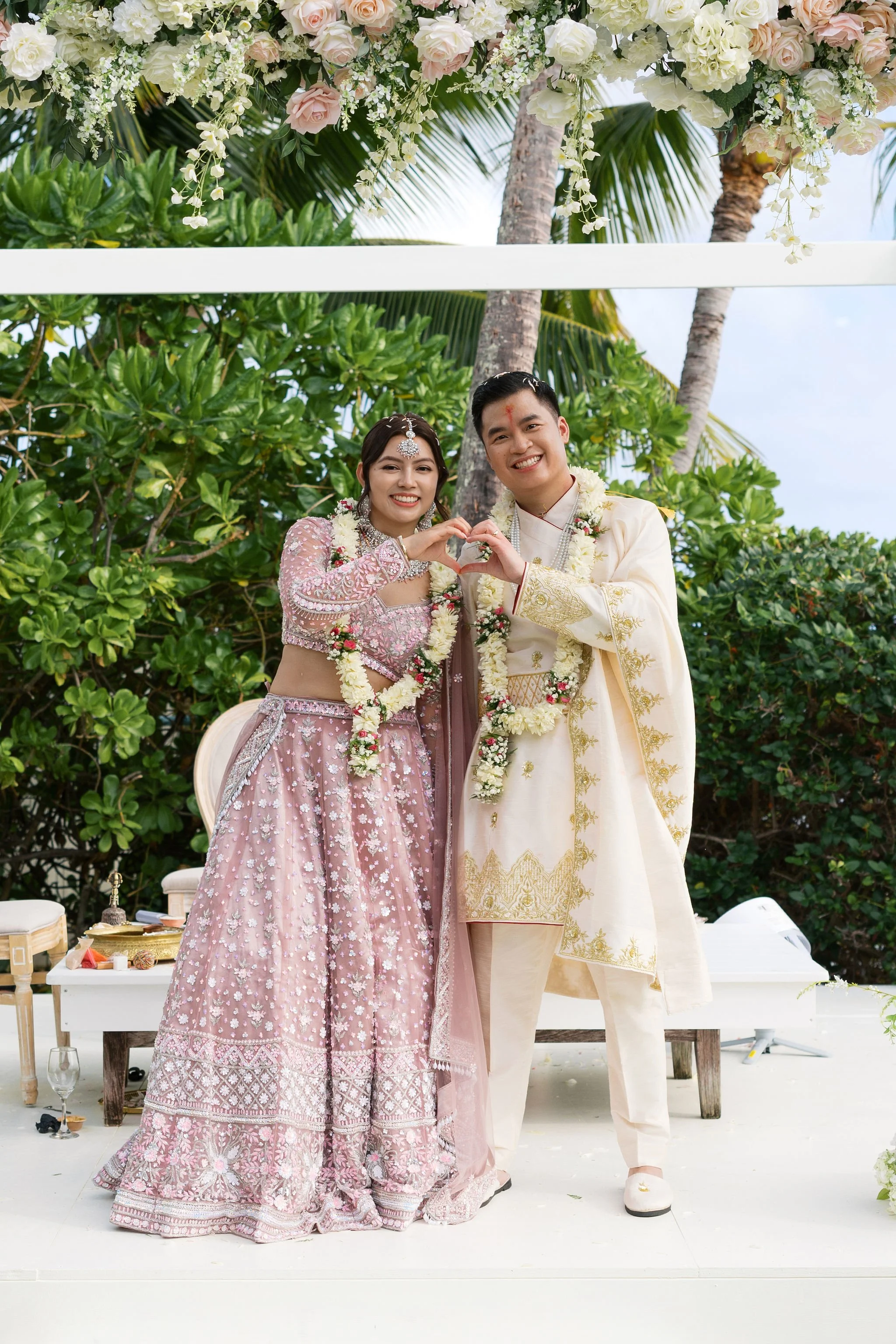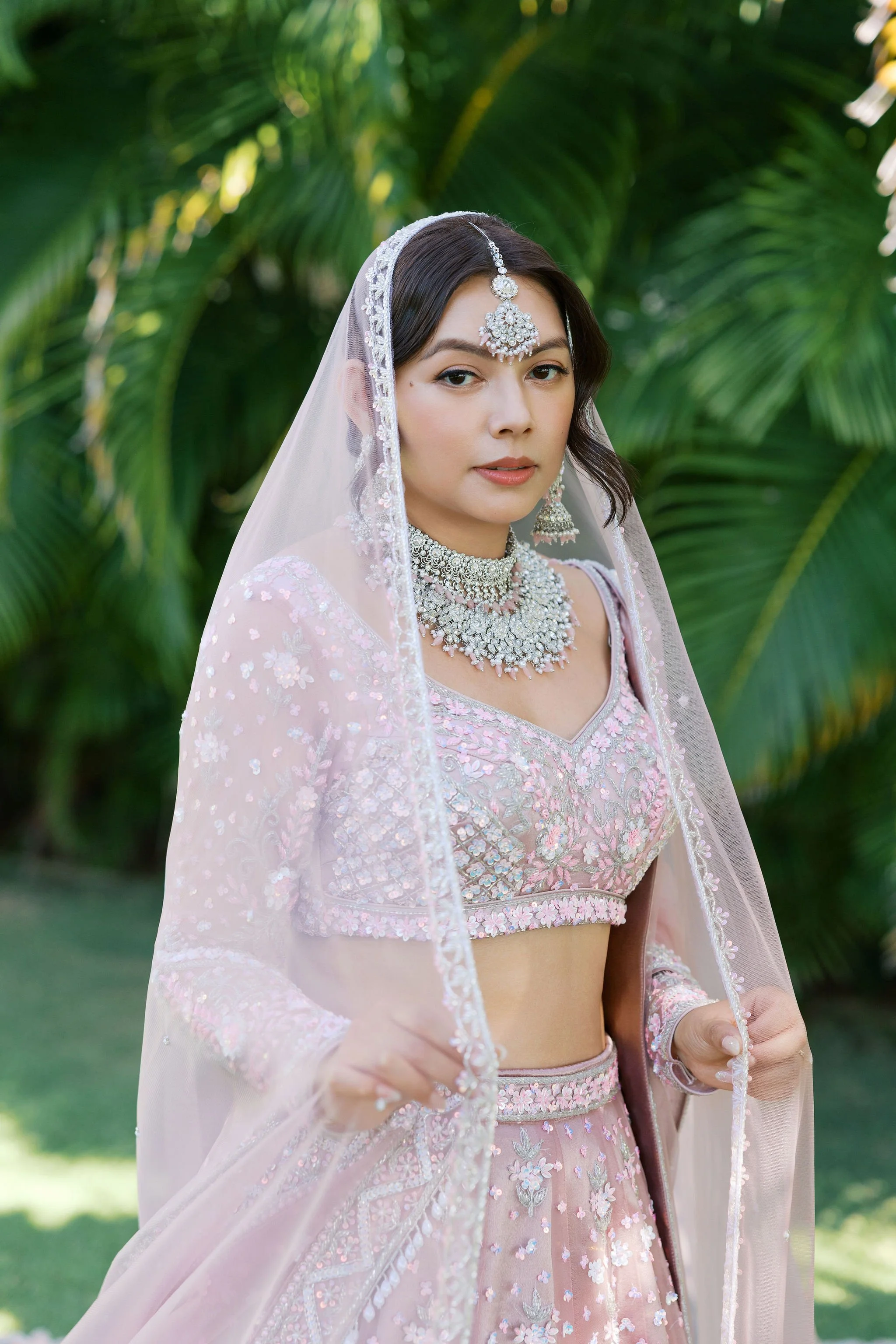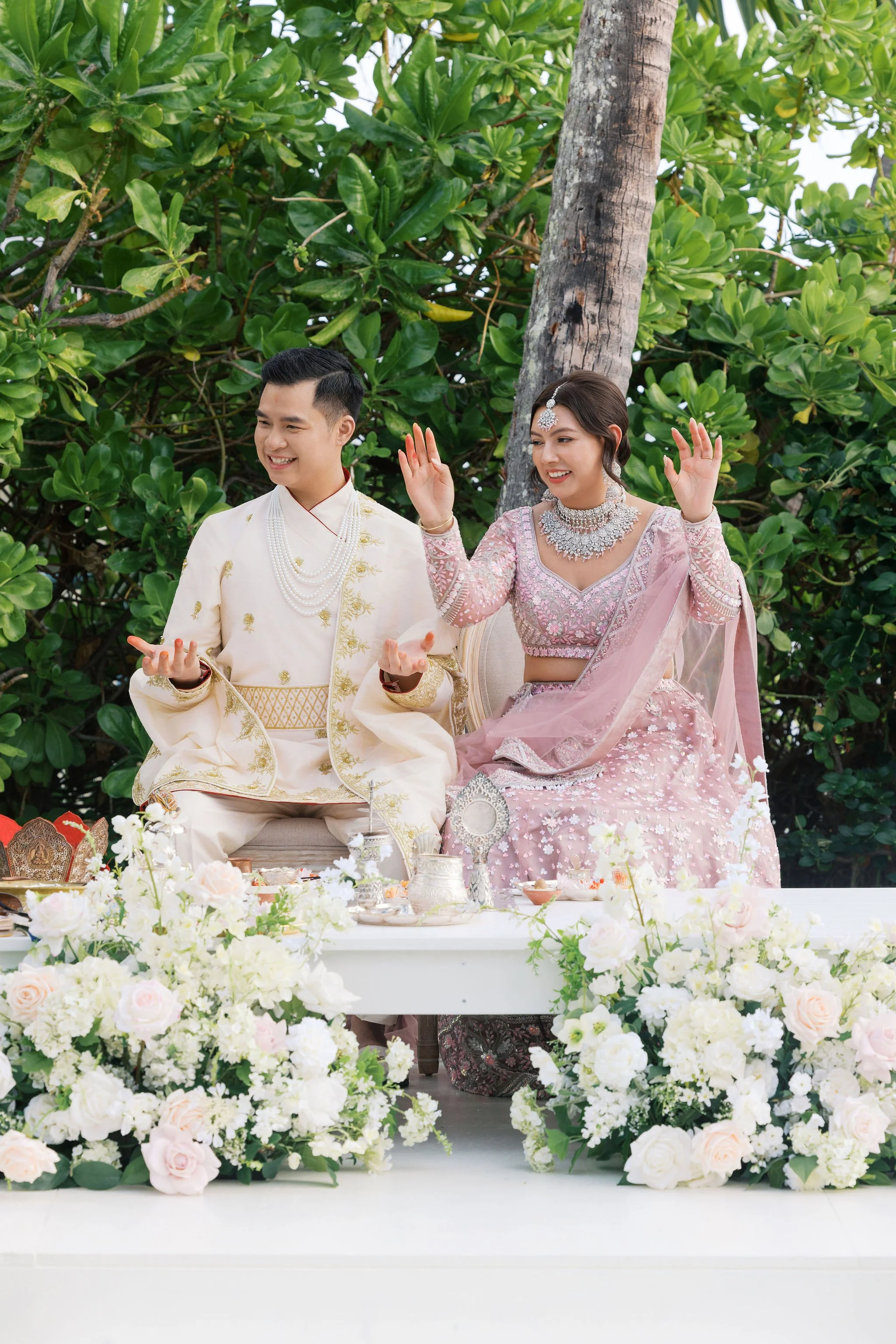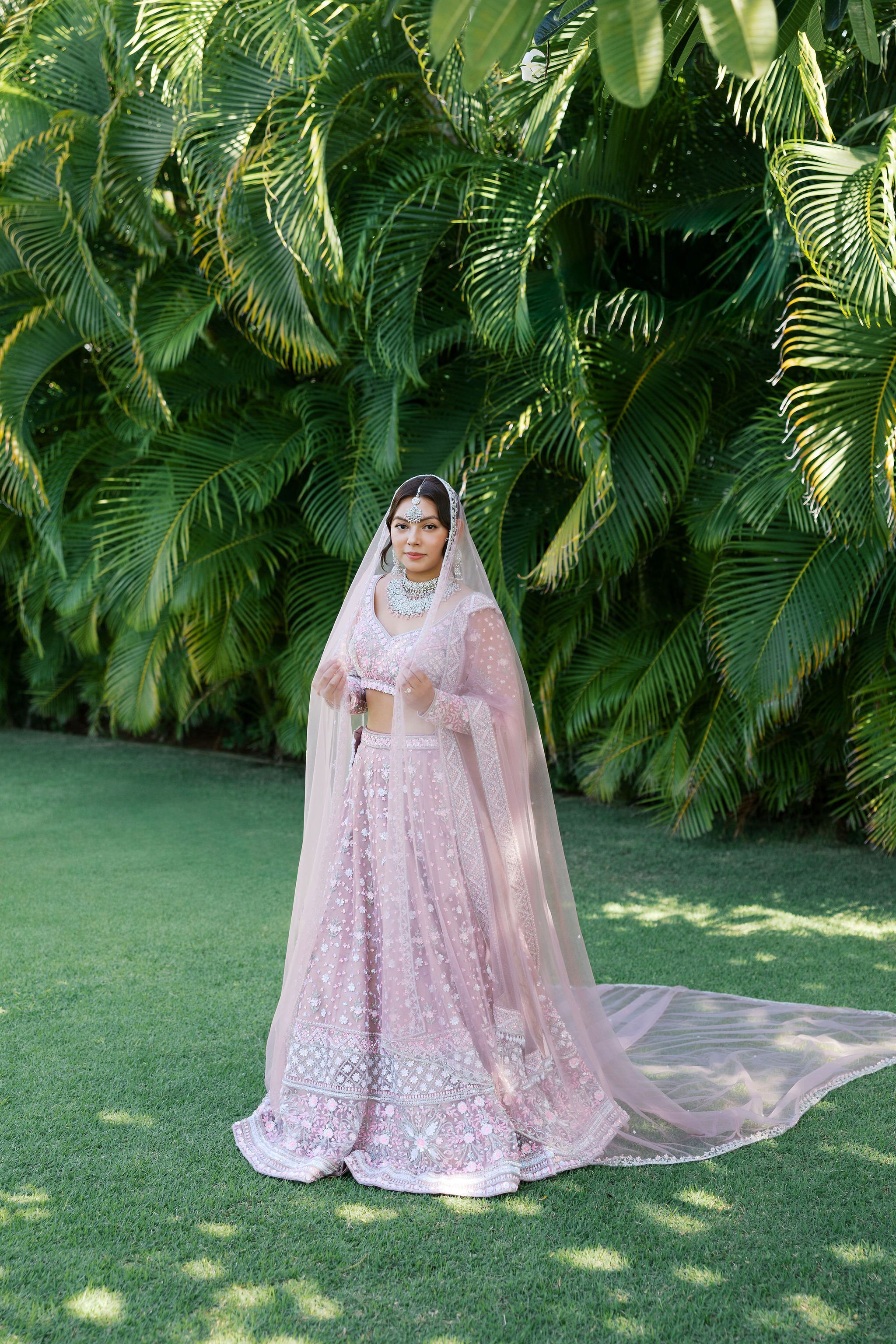 When Shradha stepped into her traditional Nepali bridal attire, the entire atmosphere shifted. The intricate details, elegant textures, and refined color palette created a timeless and sophisticated look against the tropical backdrop of Hawaii.