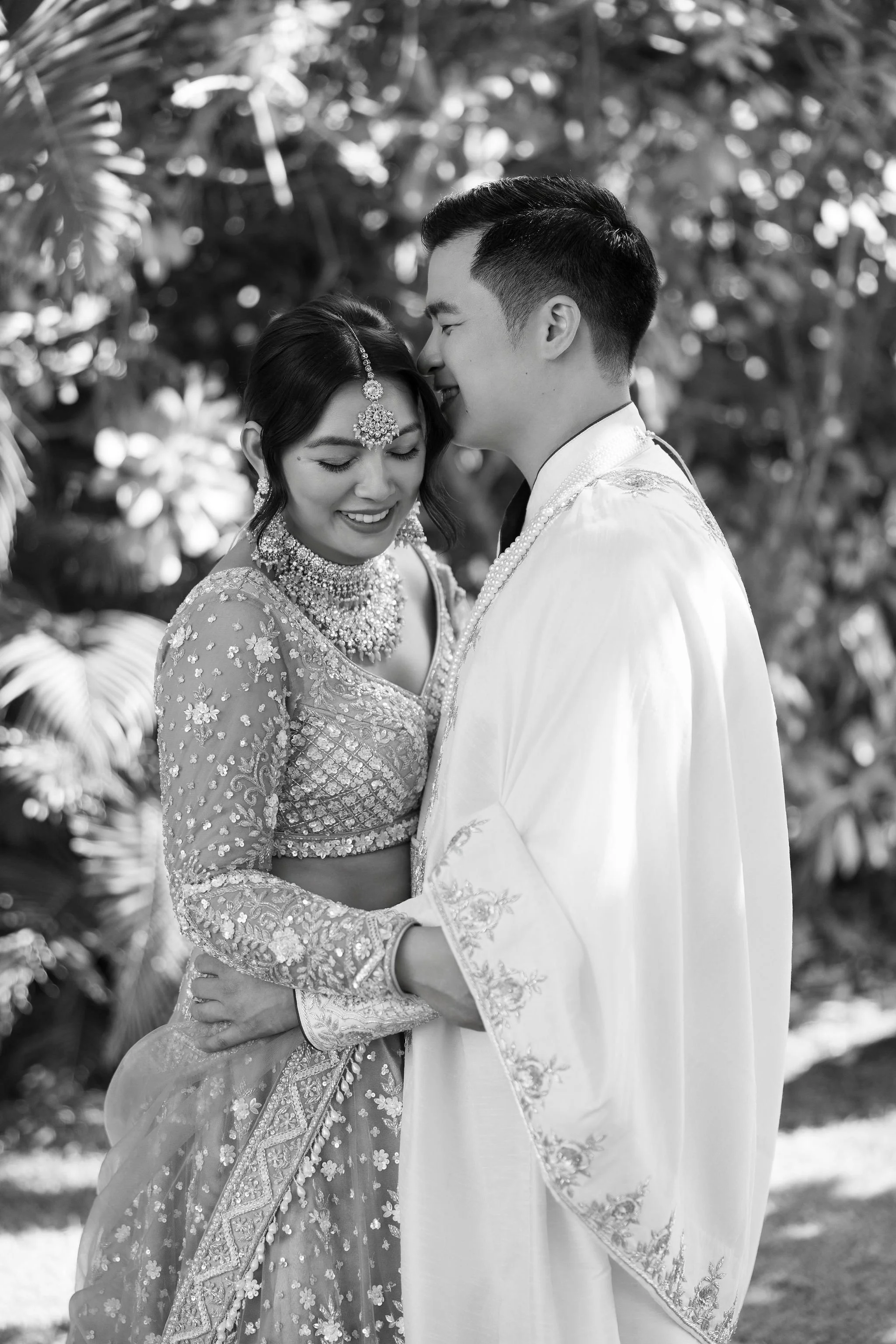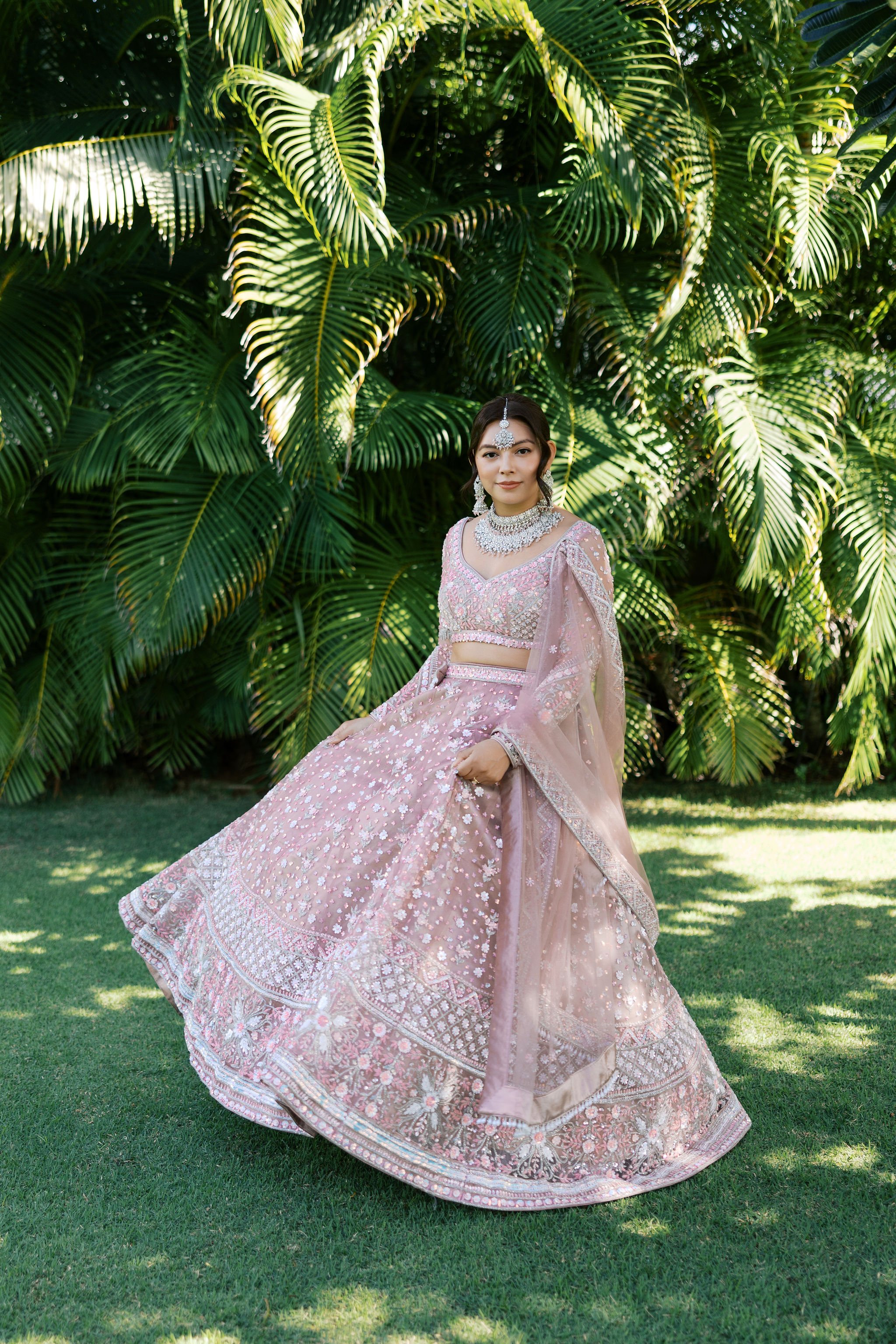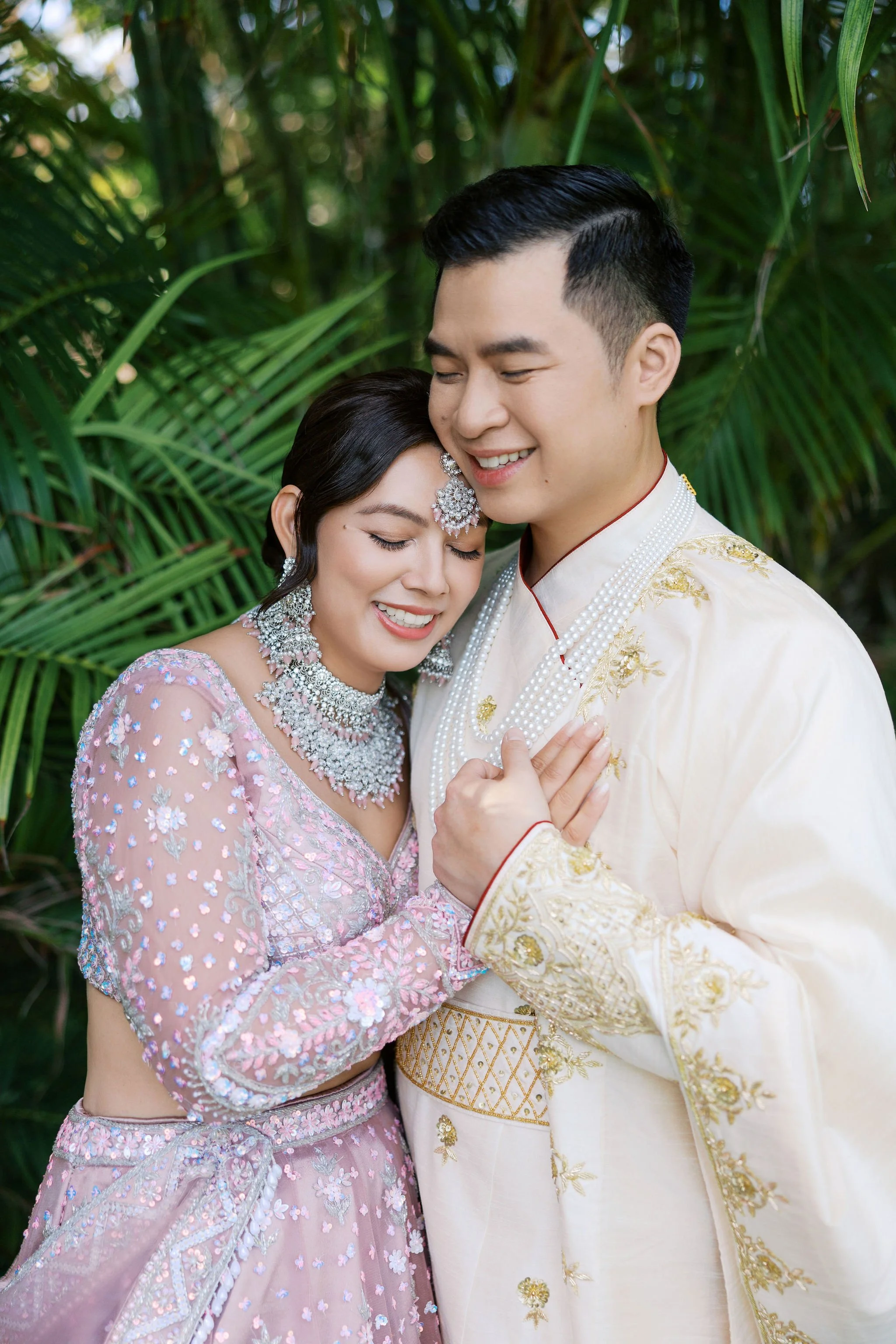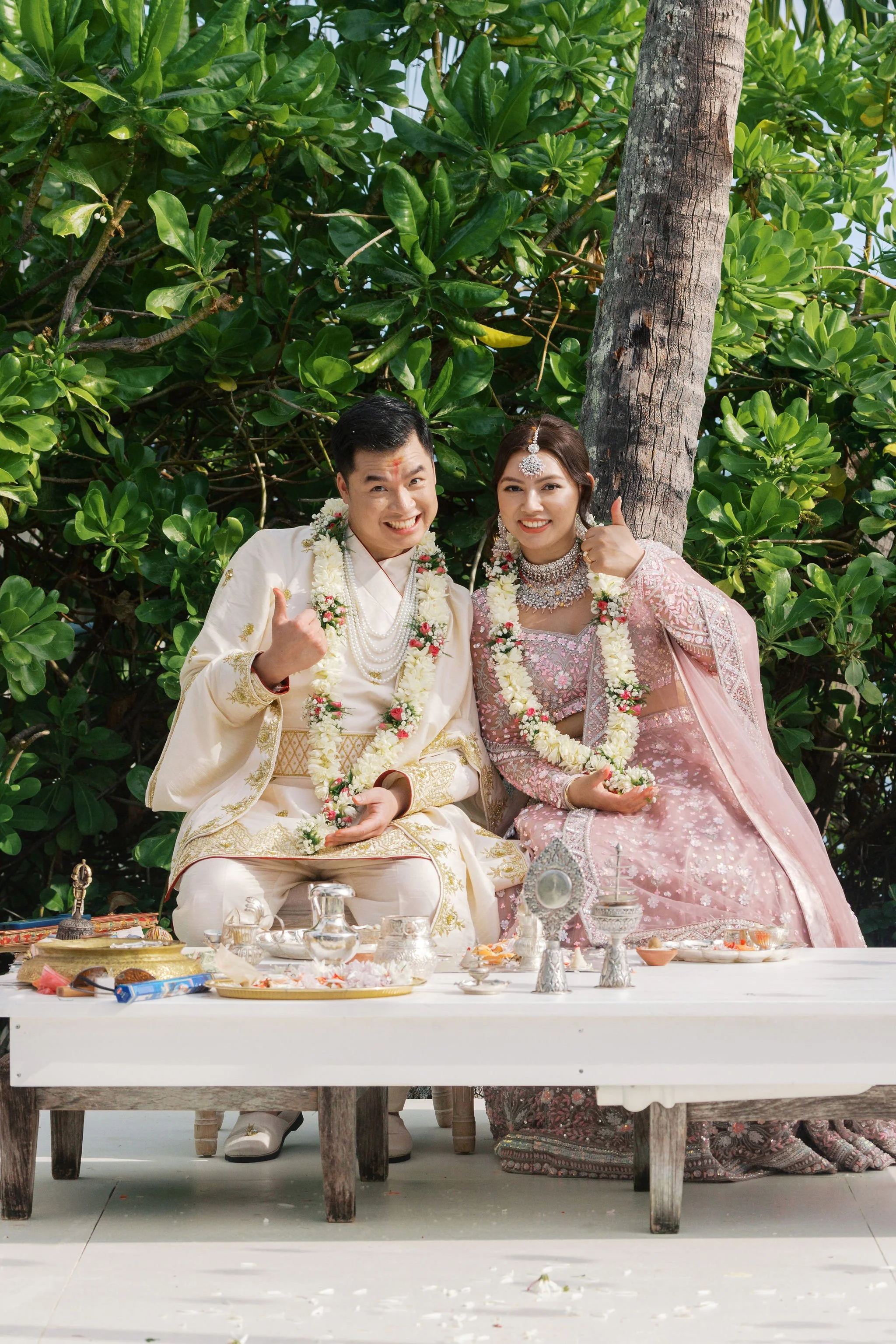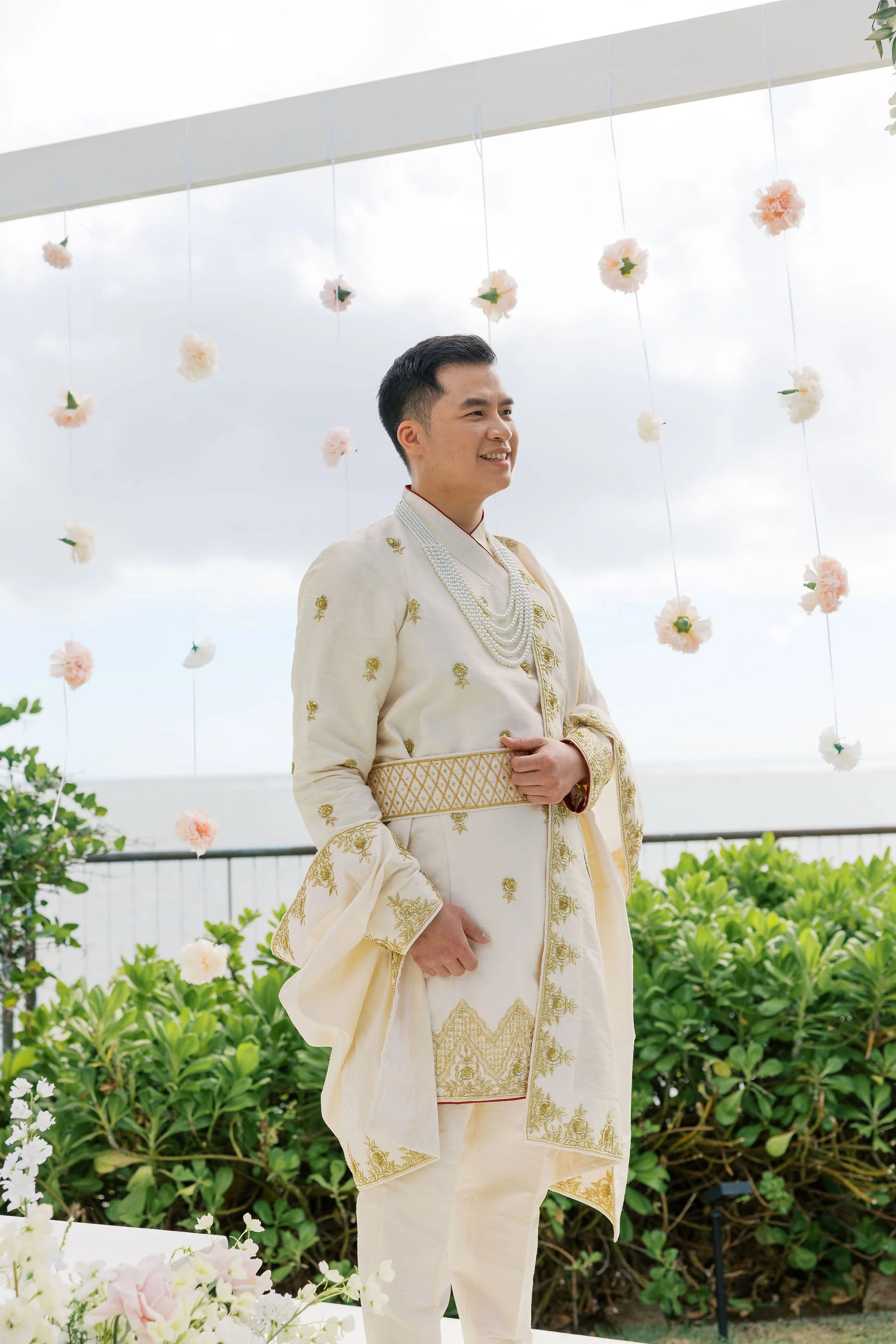 When Shradha stepped into her traditional Nepali bridal attire, the entire atmosphere shifted. The intricate details, elegant textures, and refined color palette created a timeless and sophisticated look against the tropical backdrop of Hawaii.