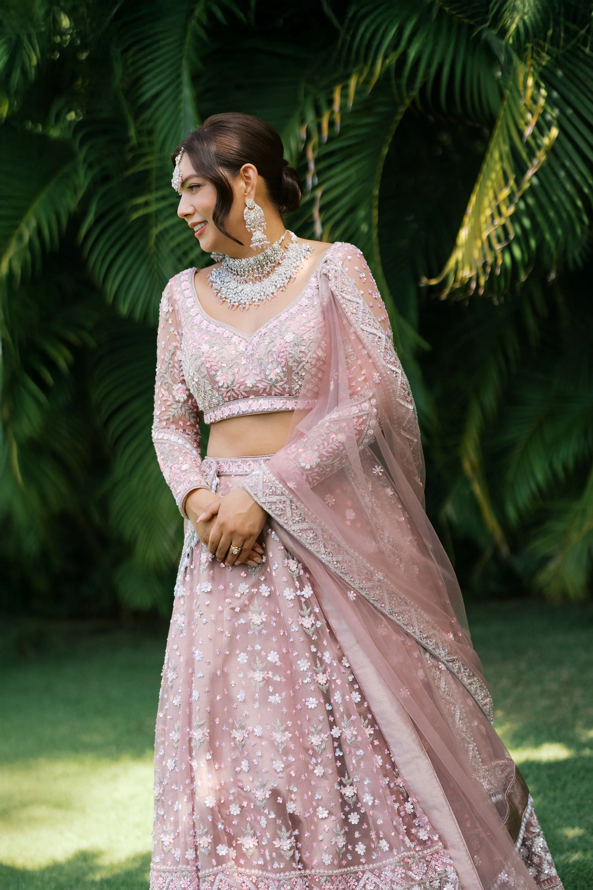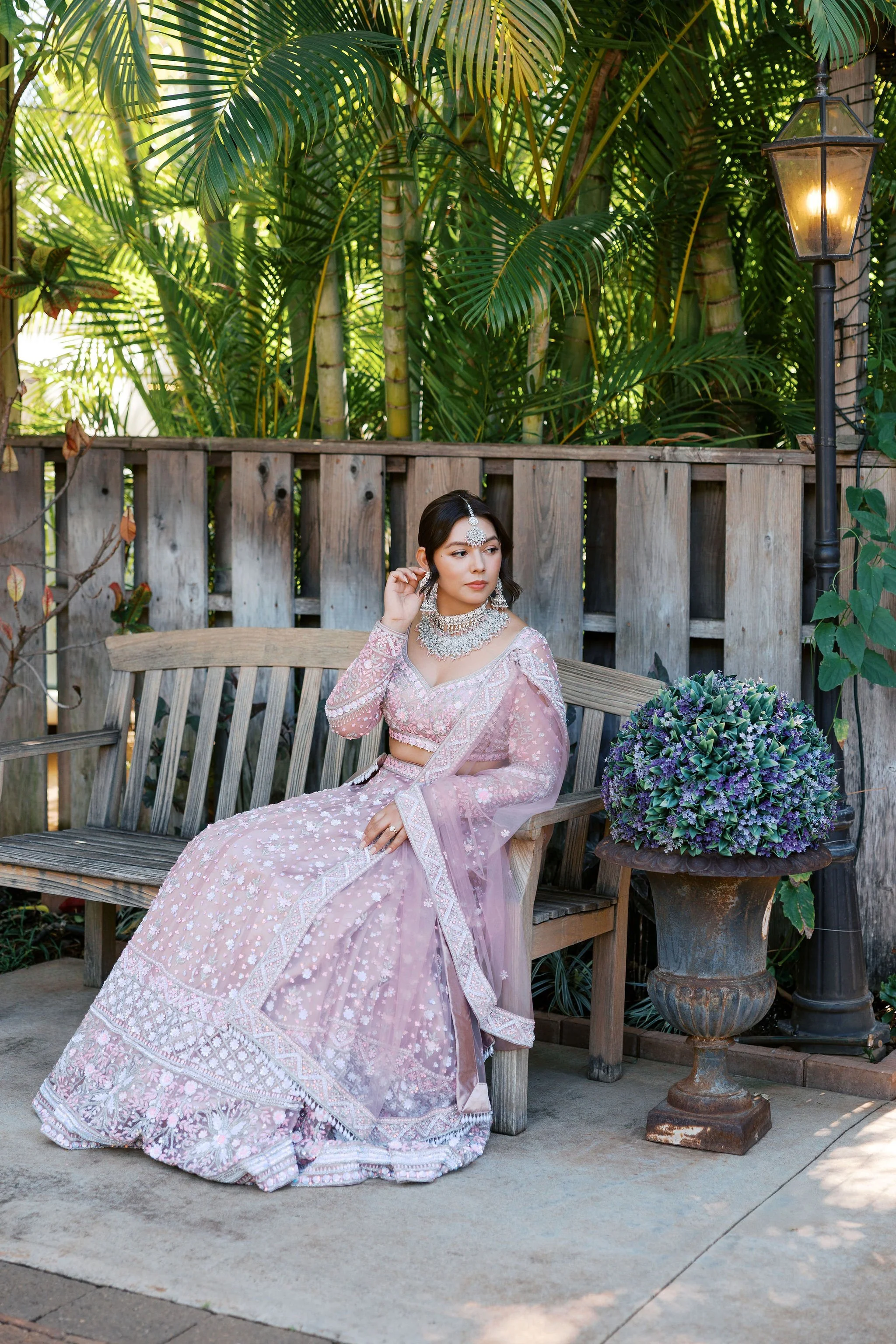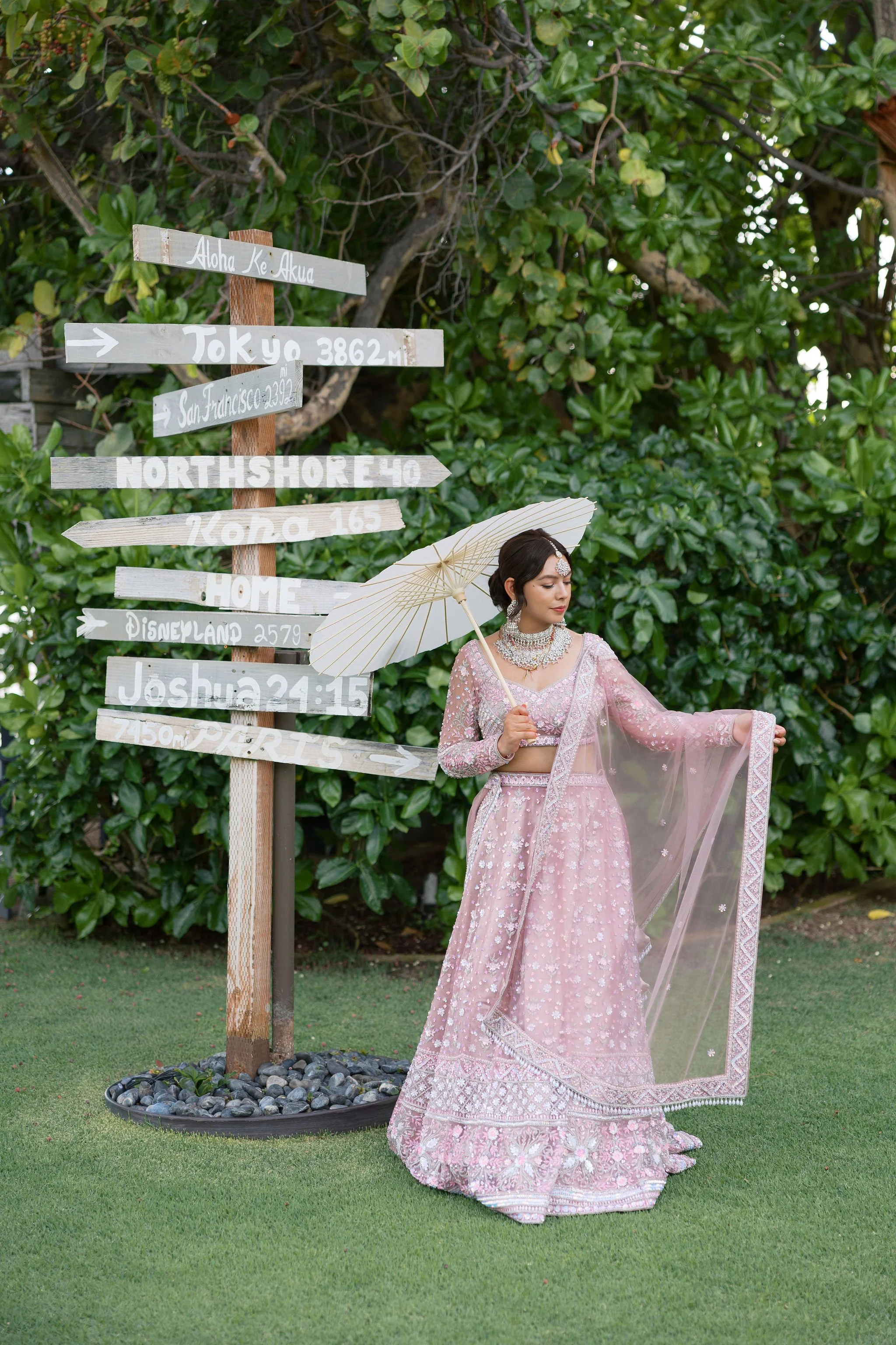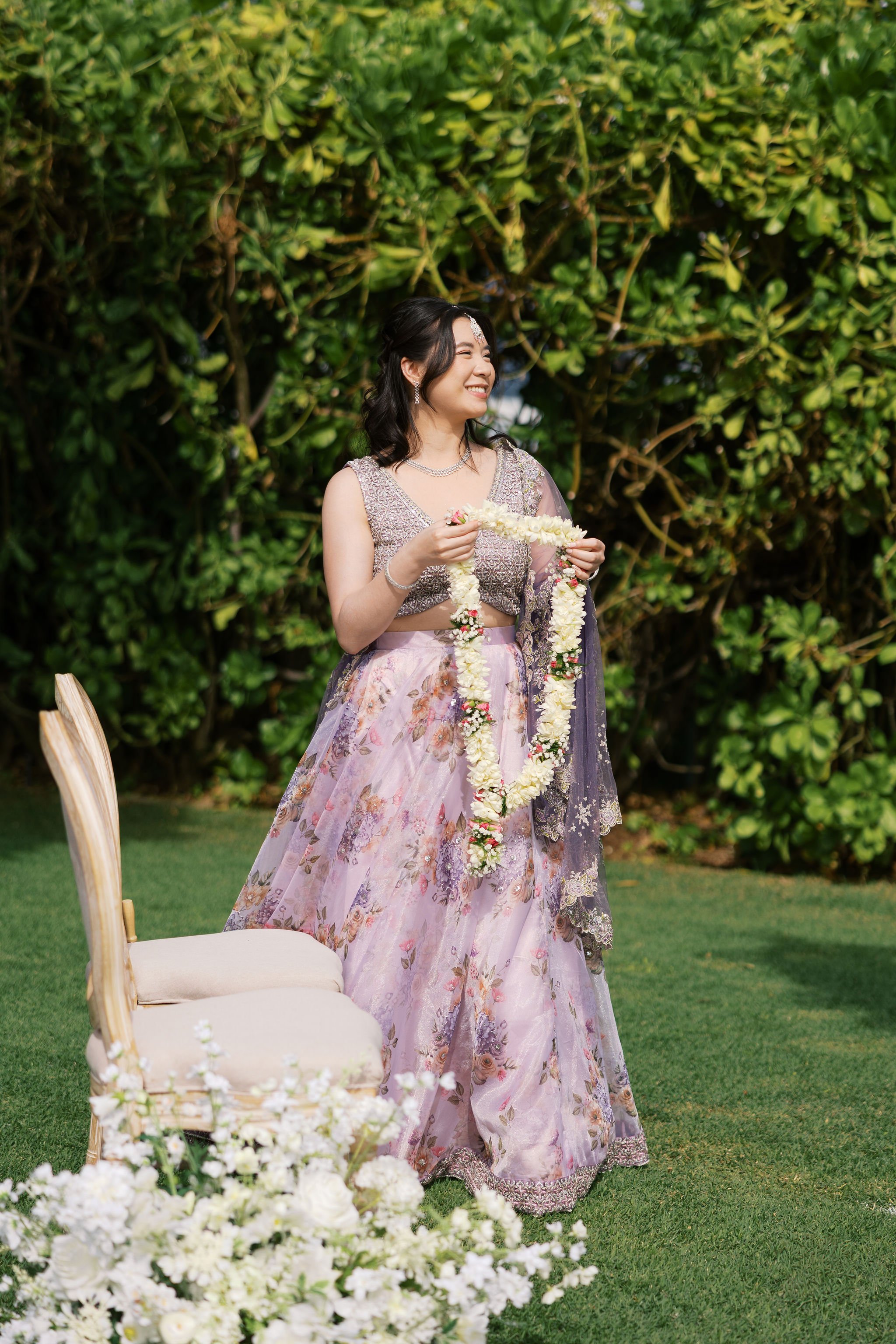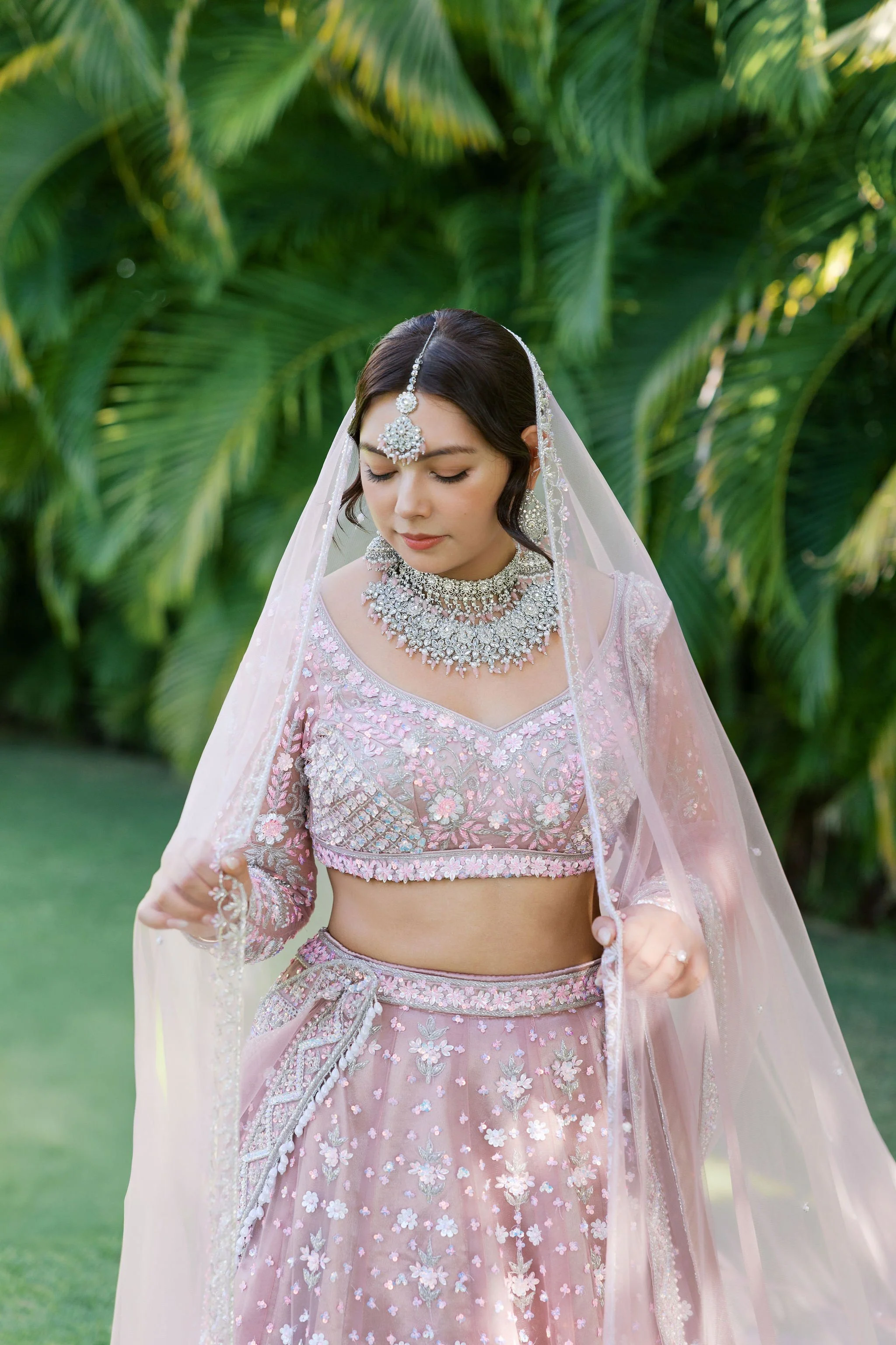 When Shradha stepped into her traditional Nepali bridal attire, the entire atmosphere shifted. The intricate details, elegant textures, and refined color palette created a timeless and sophisticated look against the tropical backdrop of Hawaii.