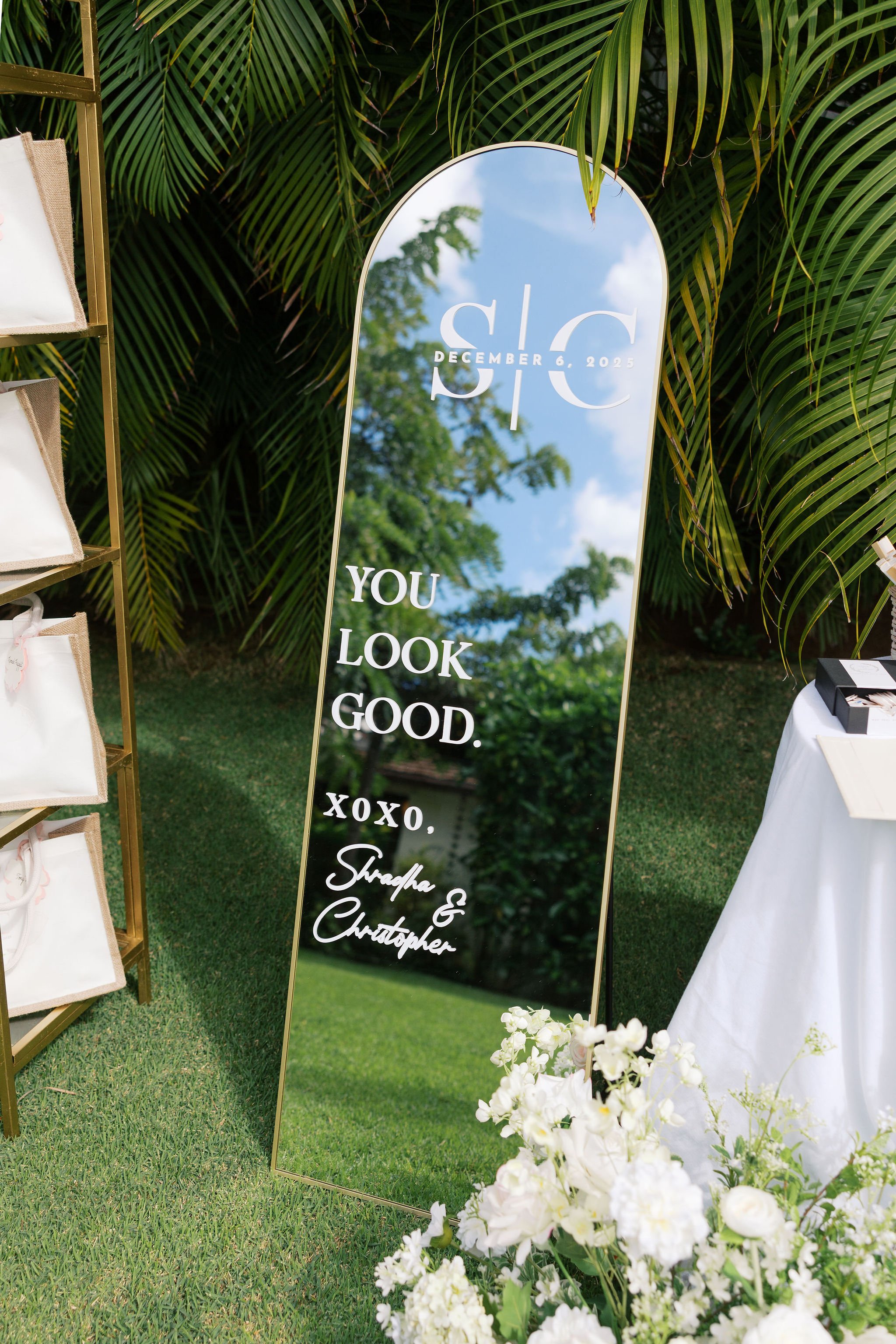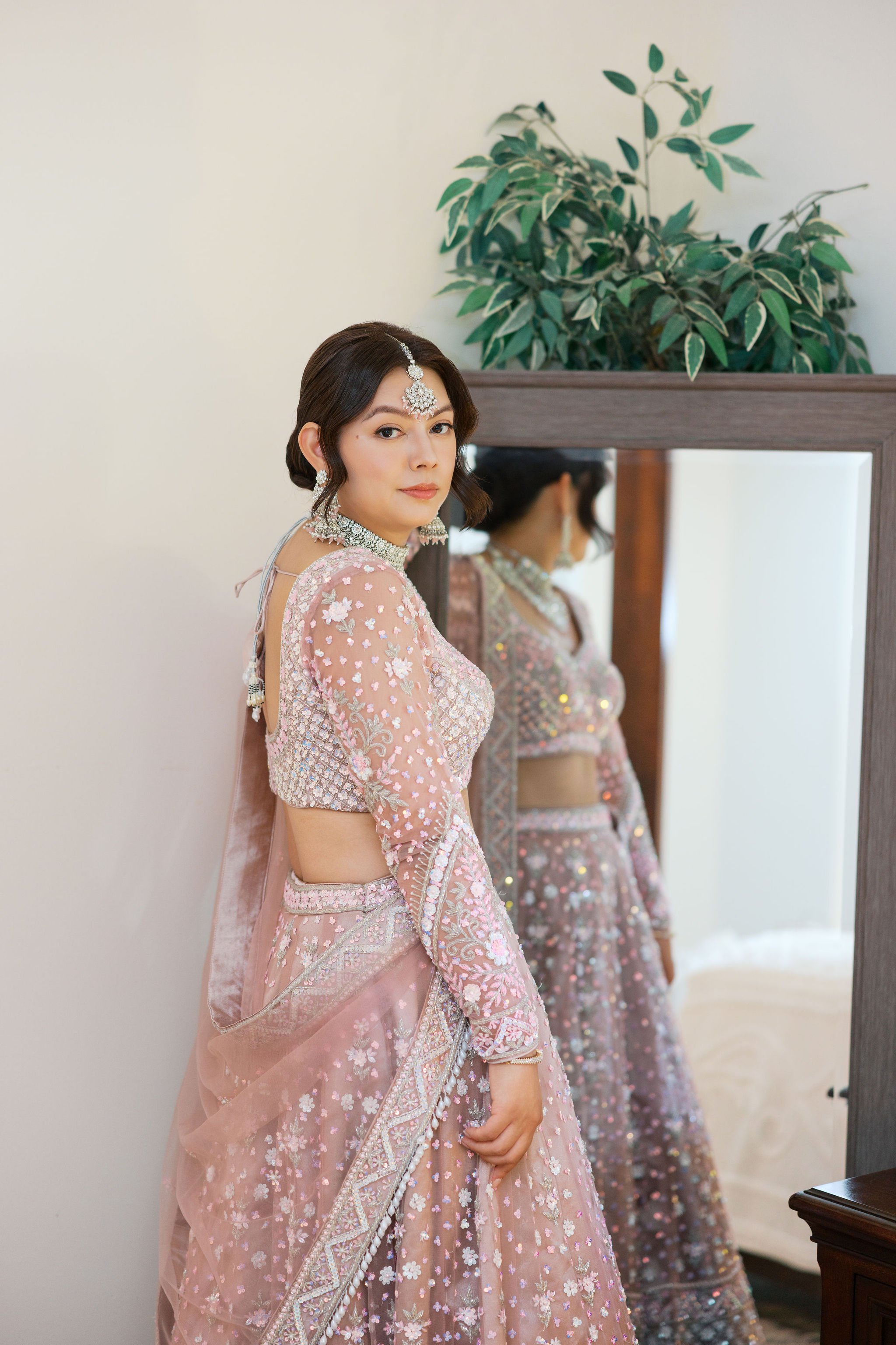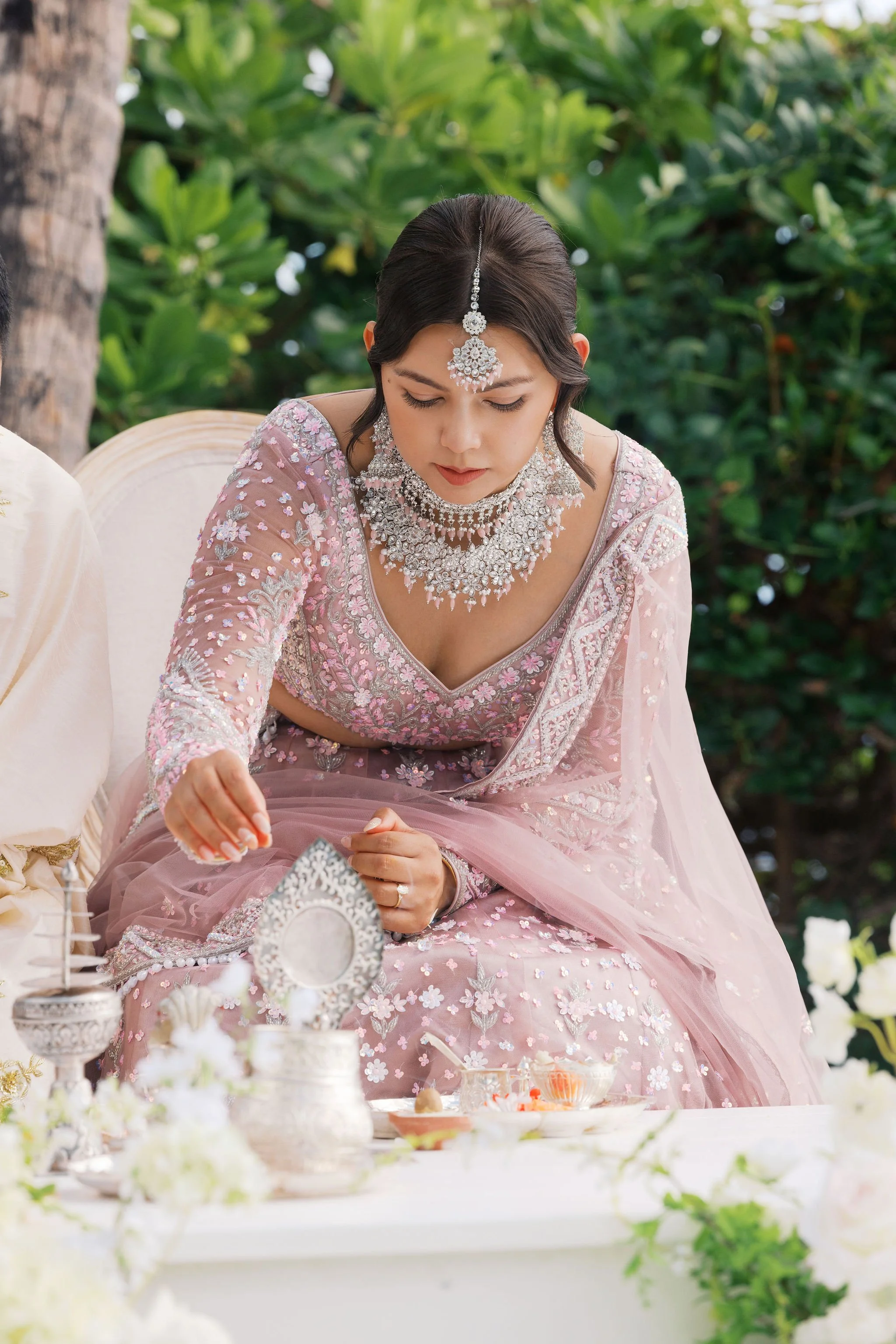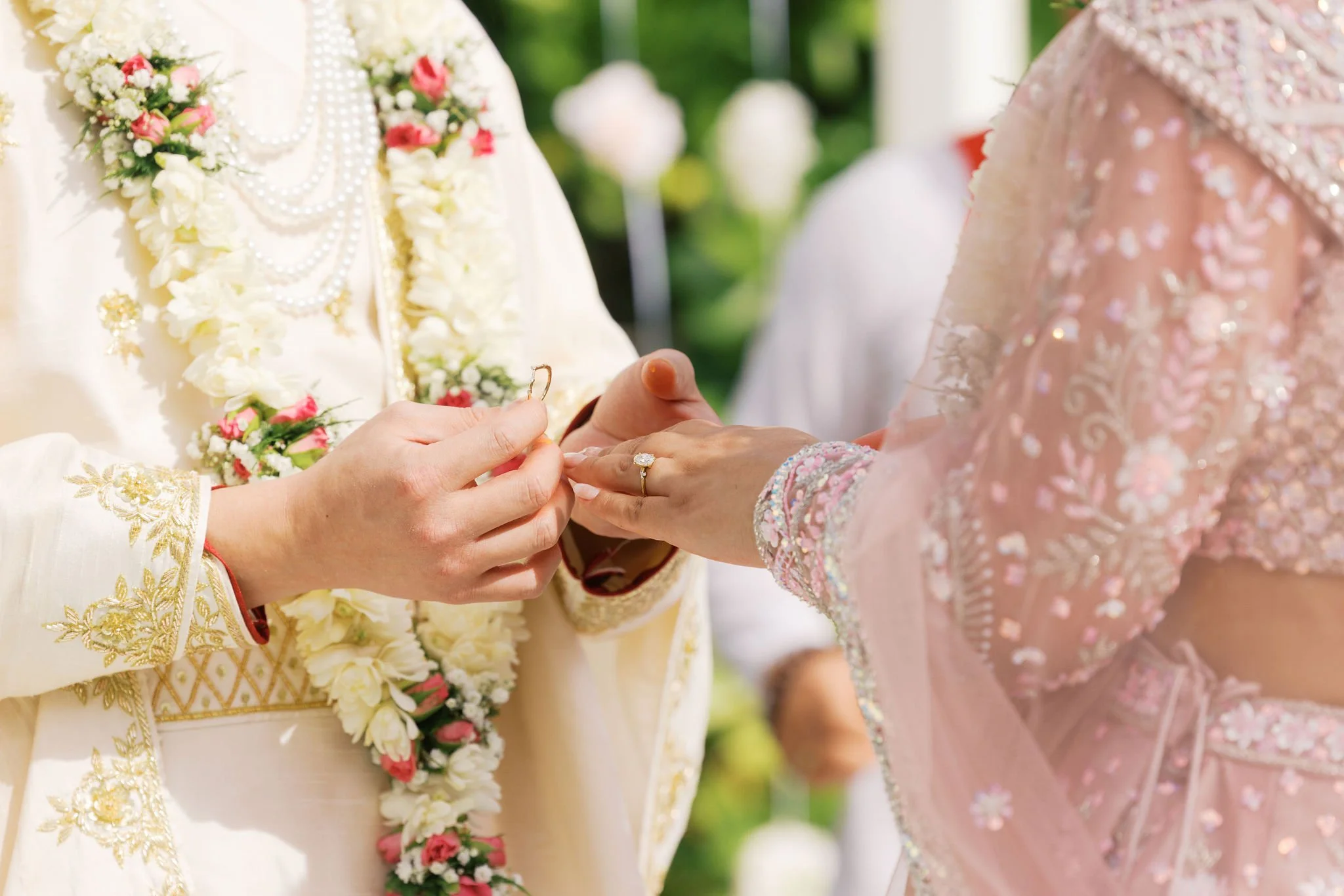 The ceremony began with purification blessings. The couple exchanged floral garlands, followed by rings. Their parents showered them with flower petals and held a mirror before them so they could see each other for the first time as husband and wife.