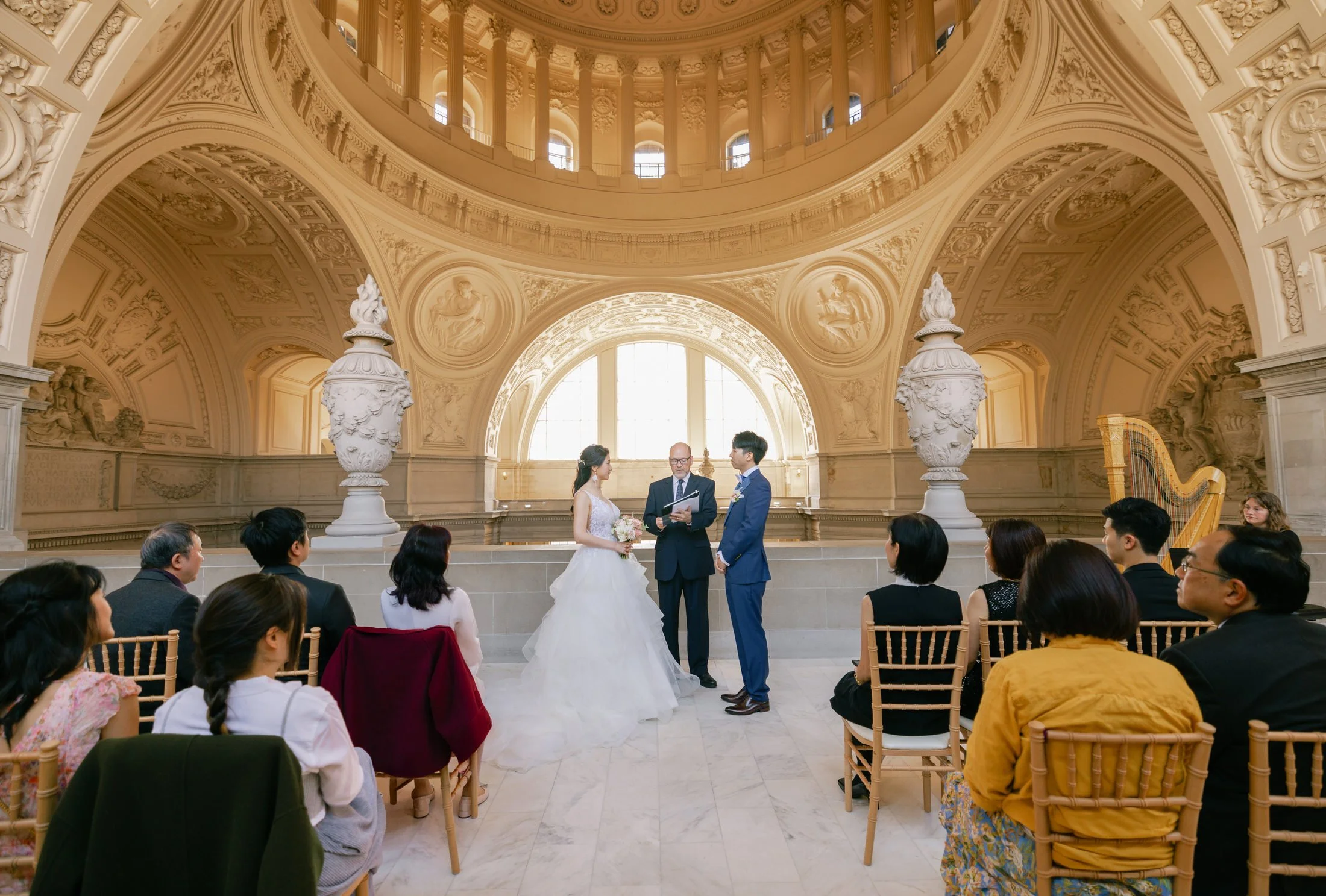 Wedding ceremony at San Francisco City Hall Fourth Floor Gallery, with live harp music